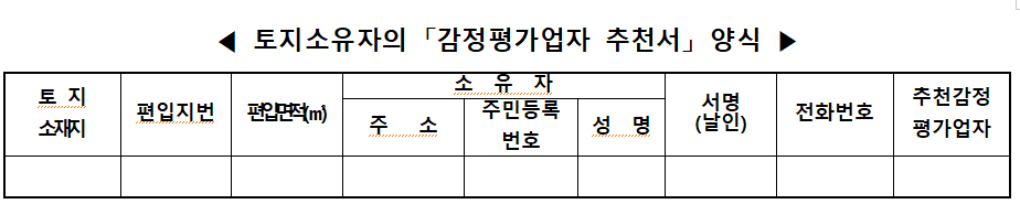 ※ 주의사항: 감정평가사 추천서 제출양식의 모든 내용은 반드시 소유자 본인의 자필로 서명(법인 및 종중의 경우 서명 대신 인감 날인)하여야 하며, 본인임을 확인하기 위한 신분증 사본(인감증명서)을 첨부하여 제출 필수