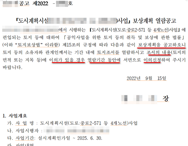 만약 공고문에 포함된 물건들이 이상이 있는데 이 보상계획열람공고 단계에서 이의신청등을 통하여 바로잡지 않은면 , 나중에 바로잡기가 매우 힘들어 지므로 위 보상계획 열람공고기간 안에, 즉 이의신청 기간 안에 확실하게 검토 후 문제가 있으면 이의신청을 하여야 한다.